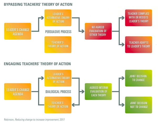 The key to working through this is the dialogical process between a teacher and a leader; understanding the teachers’ theory of action, clearly articulating yours as a leader, and agreeing on an interim theory of action. This provides a starting point, from which further change can be driven.